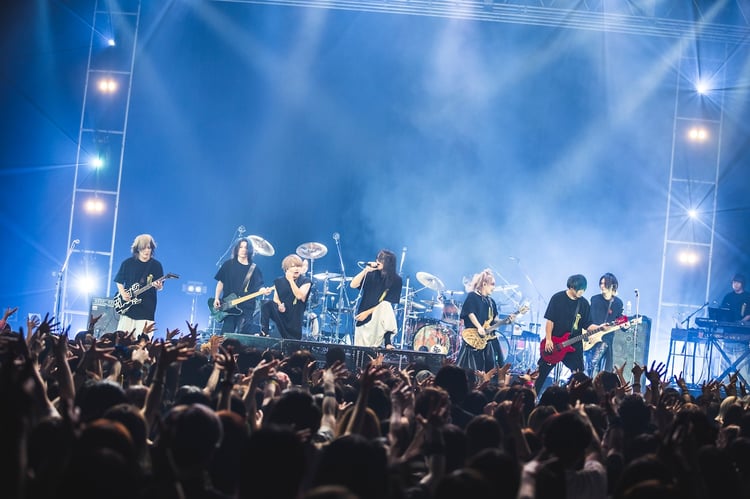 本公演ではNIGHTMAREとMUCCがお互いの楽曲をカバーする場面もあった。NIGHTMAREがMUCCの楽曲の中からセレクトしたのは「流星」。浮遊感のあるギターサウンドがたゆたうように場内を満たしていく。センチメンタルな空気をまとったYOMIは、お立ち台に座りながらエモーショナルな歌声を響かせた。「ジャイアニズム天」ではオーディエンスが一斉にジャンプ。咲人が軽やかにタッピング奏法を披露し、RUKAはドラムを乱れ打つ。最後に「極東乱心天国」で一体感のあるシンガロングが場内に広がると、NIGHTMAREのメンバーはじっくりとフロアを見渡しながらその歌声を受け取ってステージをあとにした。