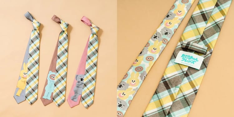 たぬきゅんフレンズの総柄生地で仕立てたバージョンのネクタイもあり、このデザインのミニネクタイもラインナップ。ミニネクタイはぬいぐるみ用として使用できるほか、3歳前後の子供も身に着けられるサイズ感となっている。