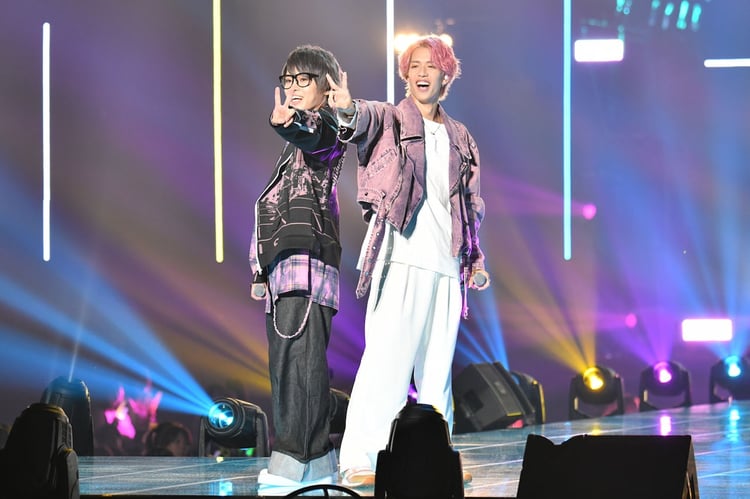 スカイピースは1995年生まれの人気YouTuber・テオくんと☆イニ☆の2人からなるユニット。YouTubeのチャンネル登録者数は470万人を超えることもあり、「スカイピース知ってるよって人?」とテオくんが観客に向けて声をかけた際には多くのペンライトが左右に揺れた。そんな客席の様子を見た2人は「いる、いる!!」と興奮気味に声を漏らすも、しばらくすると「お世辞でも(ペンライト)振りなさいよ!」と腕を微動だにしない観客をイジって笑いを誘った。