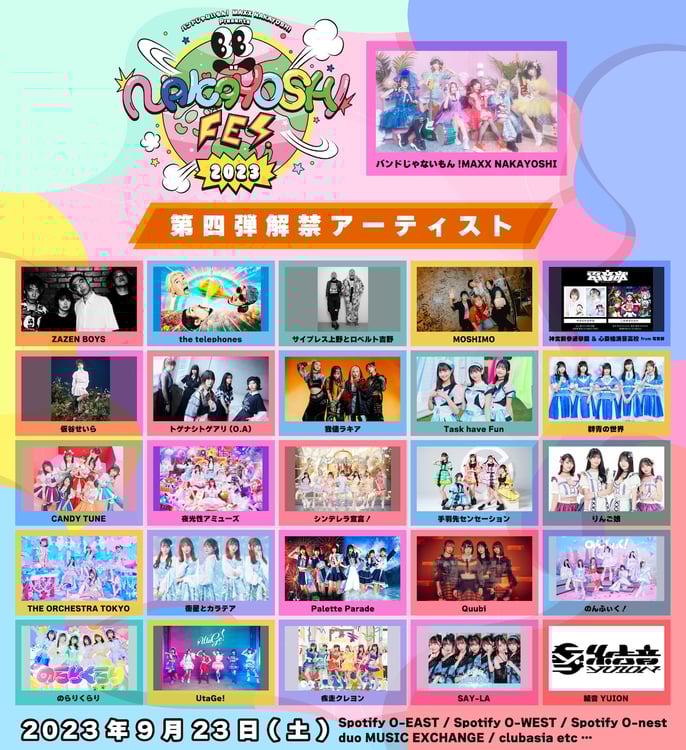 バンドじゃないもん!MAXX NAKAYOSHIが9月23日に東京・渋谷エリアの複数会場で開催するサーキットイベント「NAKAYOSHI FES.2023」の出演アーティスト第4弾が発表された。