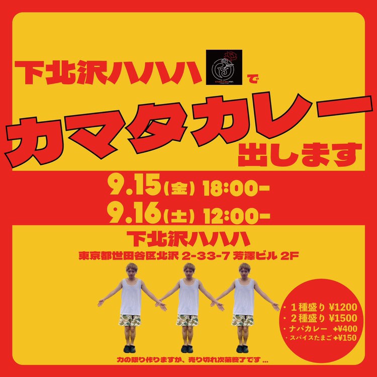 FOMAREのカマタリョウガ(G, Cho)が、9月15、16日に東京の飲食店・下北沢ハハハでスパイスカレー“カマタカレー”を提供する。