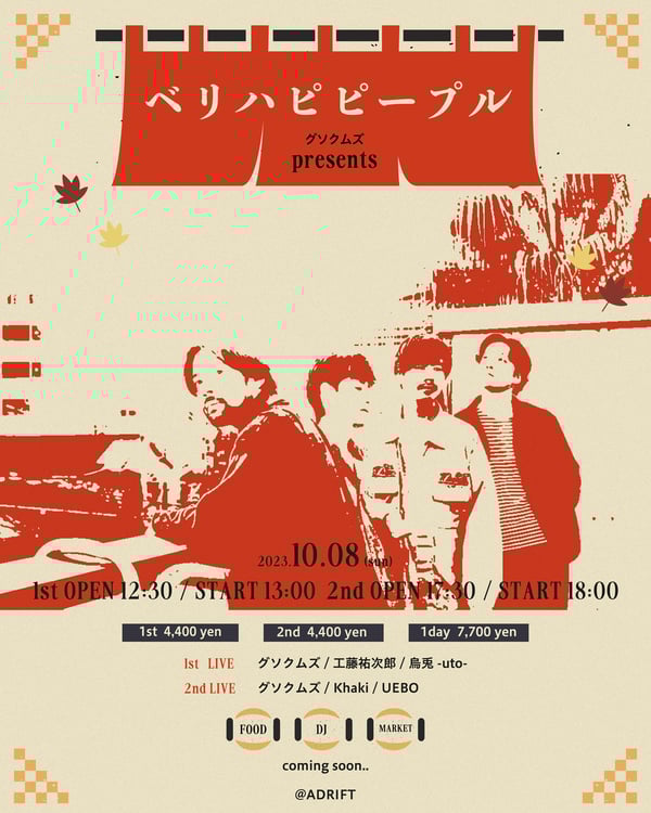 グソクムズの主催イベント「ベリハピピープル」が10月8日に東京・下北沢ADRIFTで開催される。