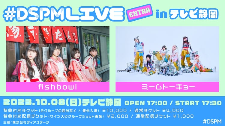 fishbowlとミームトーキョーのツーマンライブ「#DSPMLIVE EXTRA in テレビ静岡」が10月8日に静岡・テレビ静岡本社で開催される。