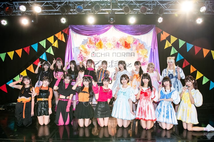 この日、OCHA NORMAは「同世代」と「先輩」というテーマのライブナタリー2公演に登場。昼にFRUITS ZIPPER、夜にでんぱ組.incとツーマンライブを行った。昼と同様、夜公演も新宿BLAZEは大勢の観客による熱気でいっぱいに。先攻を務めた“先輩アイドル”でんぱ組.incは「でんぱれーどJAPAN」などを序盤に畳みかけ、場内をあっという間に唯一無二のカオスな世界観で支配する。フロアで声援を響かせるオーディエンスはもちろん、会場後方の関係者エリアで見学していたOCHA NORMAメンバーも、めまぐるしい展開の楽曲、ハロー!プロジェクトとは異なるエネルギーを放つパフォーマンスに夢中になっていた。