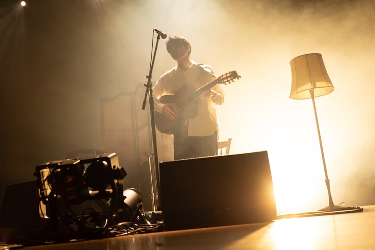 2013年6月30日に東京・おんがくのじかんで初めてライブを行い、今年で10周年に突入した折坂。「折坂悠太 らいど 2023」は初ライブの地・おんがくのじかんで初日を迎え、寺、芝居小屋、博物館などさまざまな施設で開催された。ツアーファイナルで彼は総キャパ数2000人以上となるホール会場にて、ギター1本で演奏を繰り広げた。