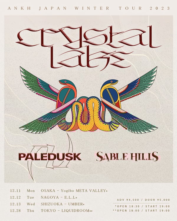 Crystal Lakeは本日10月5日に静岡・ElectricLadyLandでツアー「ANKH WESTERN JAPAN TOUR 2023」を終えたばかり。新たなツアーで彼らは12月11日に大阪・Yogibo META VALLEY、12日にElectricLadyLand、13日に静岡・Shizuoka UMBER、そして28日に東京・LIQUIDROOMの4カ所を回る。各公演にはPaledusk、SABLE HILLSがゲストとして出演する。