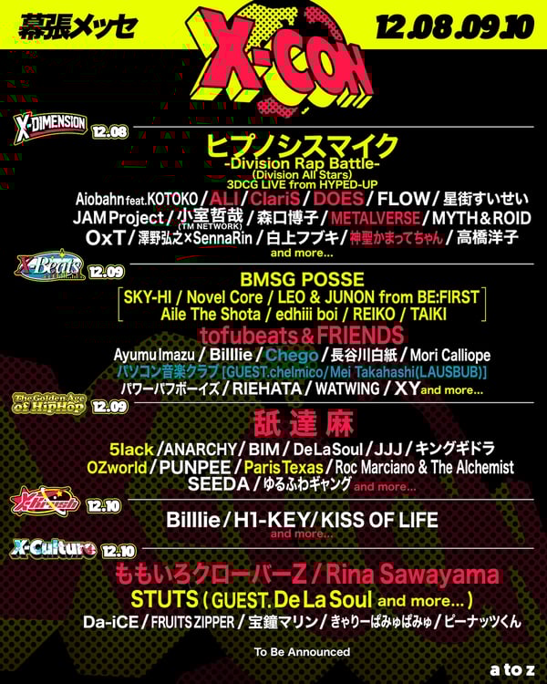 出演アーティスト第4弾として、12月8日公演「X-Dimension」にALI、ClariS、DOES、METALVERSE、神聖かまってちゃんが追加に。同公演の「ヒプノシスマイク -Division Rap Battle-(3DCG LIVE from HYPED-UP)」のステージには、Buster Bros!!!、MAD TRIGGER CREW、Fling Posse、麻天狼、どついたれ本舗、Bad Ass Templeの全メンバーがDivision All Starsとして集結することが発表された。