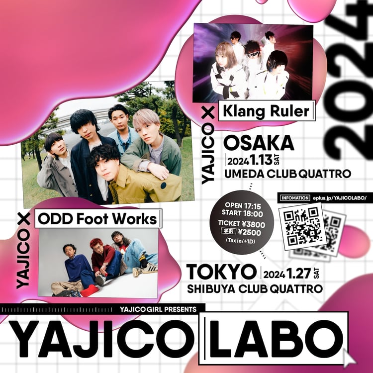 1月13日に大阪・梅田CLUB QUATTRO、1月27日に東京・渋谷CLUB QUATTROで開催される「YAJICOLABO 2024」。本公演のゲストとして大阪公演にKlang Ruler、東京公演にODD Foot Worksの出演が明らかになった。イープラスでは10月29日23:59までチケットの先行予約申し込みを受け付けている。
