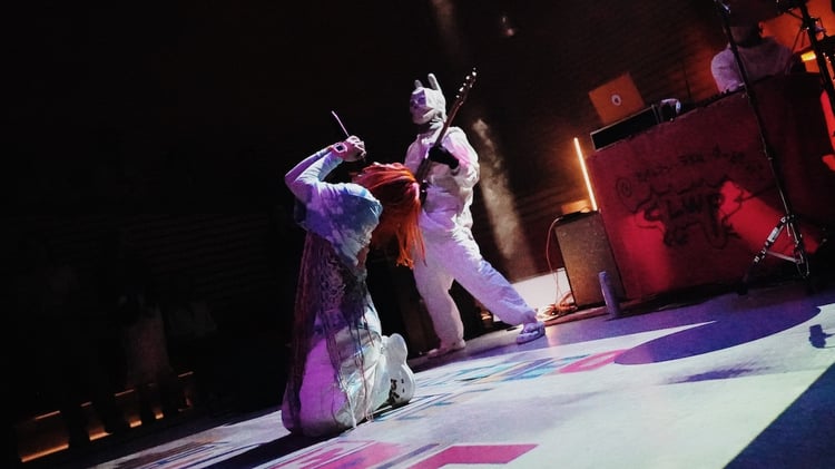 MCではChi-が「日本から来ました、カメレオン・ライム・ウーピーパイです! オーストラリアで初めてパフォーマンスできることをすごく楽しみにしていました!」と英語で挨拶。現地のオーディエンスから歓声を浴びると、その後は「scrap」や「Dear Idiot」とドープな楽曲を連発していく。ファットなビートとどこかオリエンタルなサウンド、ダルなムードの歌声。CLWPならではの不思議なバランスが、会場の空気を瞬く間に変えていった。続く「Unplastic Girl」では、オーストラリアの先住民であるアボリジナルの人々の長いパイプのような管楽器・ディジュリドゥの音色を使ったアレンジを披露。この曲では床に映し出された人型に合わせて3人が寝そべり、Chi-はしばらく寝転がったまま歌唱した。