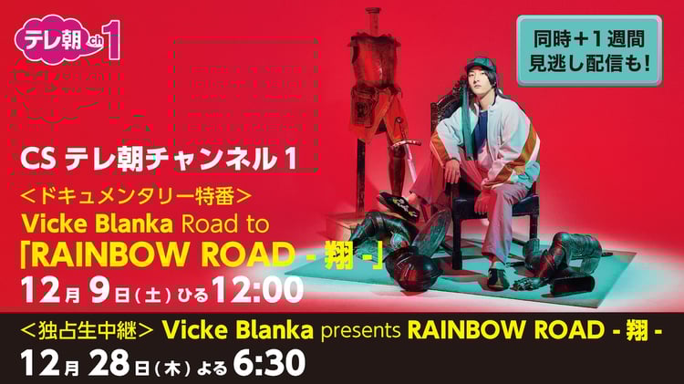 さらにCSテレ朝チャンネル1では、「RAINBOW ROAD -翔-」独占生中継を前に、ビッケブランカの2023年の活動の裏側に密着した特別番組「Vicke Blanka Road to『RAINBOW ROAD -翔-』」が12月9日に放送される。