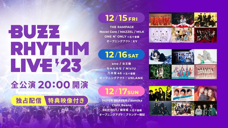 “今絶対見ておくべきアーティスト”が参加するイベントとして2015年にスタートした「バズリズム LIVE」。Huluストアでは12月15日にTHE RAMPAGE from EXILE TRIBE、Novel Core、MAZZEL、M!LK、ONE N' ONLY、XY、16日にano、女王蜂、ちゃんみな、NiziU、乃木坂46、UNLAME、17日にSUPER BEAVER、Chilli Beans.、BE:FIRST、龍宮城、ブランデー戦記のステージを視聴できるほか、ライブの裏側に関するトークを聴くことができる。なおアーカイブ配信は12月31日まで行われる。