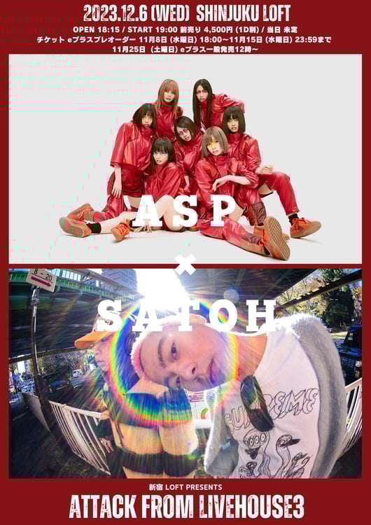 今回出演するのはASPとSATOHの2組。イープラスでは11月15日までチケットの先行予約を受付中。