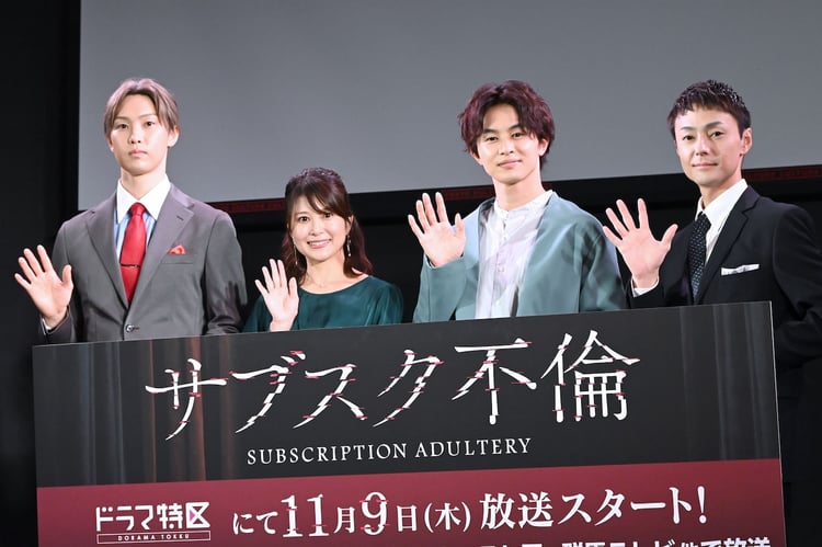 本日11月9日よりtvk、MBSほかでスタートするドラマ「サブスク不倫」の完成披露トークイベントが東京都内で行われ、佐津川愛美、草川拓弥(超特急)、堀夏喜(FANTASTICS)、木村了が登壇した。