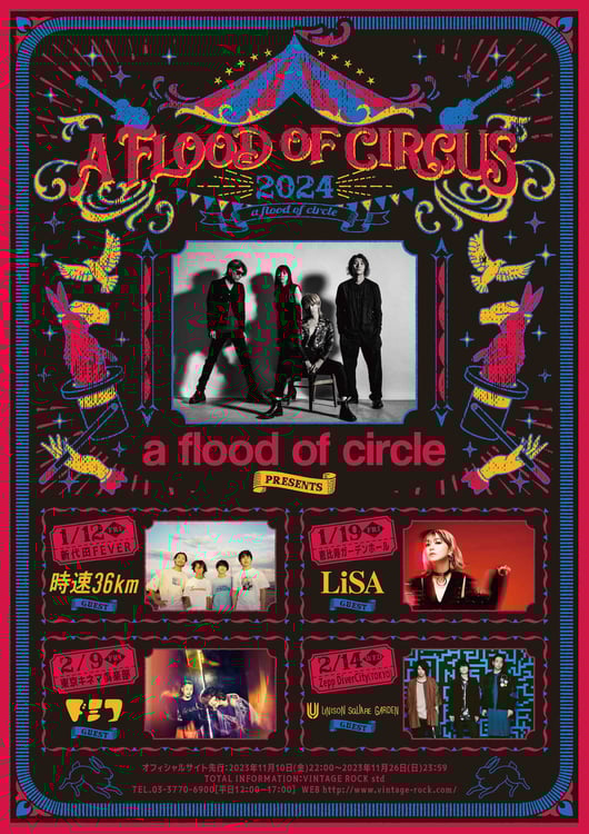 「A FLOOD OF CIRCUS」は2016年にスタートしたa flood of circle主催の対バン企画シリーズで、今回は1月から2月にかけて都内4会場を舞台に行われる。ゲストとして出演がアナウンスされたのはLiSA、ドミコ、時速36km、UNISON SQUARE GARDENというa flood of circleと縁の深い4組。チケットぴあでは11月26日まで各公演のチケット先行予約を受け付けている。