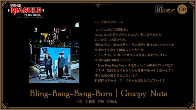 2024年1月に放送がスタートするテレビアニメ「マッシュル-MASHLE-」の第2期「神覚者候補選抜試験編」のオープニングテーマにCreepy Nutsの新曲「Bling-Bang-Bang-Born」が使用される。