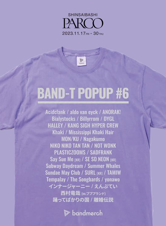 複数ミュージシャンのオフィシャルグッズを販売するショップとして、これまで関東圏を中心に開催されてきた「BAND-T POPUP」。心斎橋PARCOでの実施は今回が初で、aldo van eyck、KANG SIGH HYPER CREW、Khaki、Nagakumo、SADFRANK、Say Sue Me、Se So Neon、Tempalay、踊ってばかりの国、離婚伝説ら韓国のアーティストを含む31組が参加する。