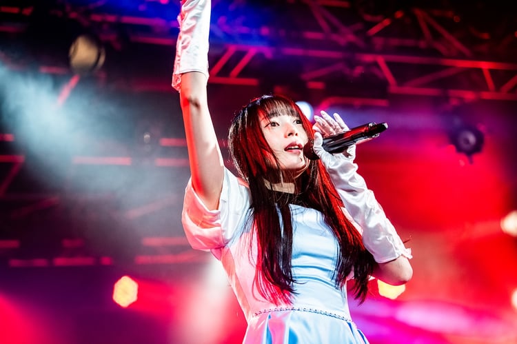 開演時刻になると、まずはミミミユが1人でステージへ。MIGMA SHELTERの衣装ではなく、白と水色のドレス姿で現れたミミミユは、アシッドなシンセベースが鳴り響く中「Diva」を舞うように踊り歌う。メランコリックな「Inner Down」では、長い髪を振り乱し感情を込めて歌うミミミユをスポットライトが美しく照らした。「愛してるー!」という客席からの声にミミミユが「愛してるよー」と返しつつ手袋を外すと、BELLRING少女ハート「UNDO」のイントロが流れ出し、場内は騒然。ミミミユはこれまでの歴史を振り返るようにベルハー時代の楽曲を1人で歌い、観客は盛大なコールを送った。