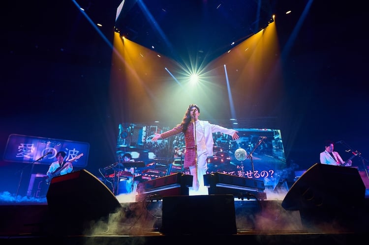 「大人の涙」の収録曲の中でひと際異彩を放っていたのが、はっとりがヤユヨのリコ(Vo, G)とデュエットするムード歌謡調の「嵐の番い鳥」。ステージのスクリーンでは、はっとりと田辺に“そっくり”のサラリーマンが登場するドラマ仕立ての映像がスタートした。はっとり演じる部下と田辺演じる上司は千鳥足でスナックへ。田辺はスナックのママに一目惚れし、東京・新橋SL広場で彼女を抱き寄せた。これをきっかけに、ステージにはそろいの白スーツに着替えたメンバーが登場。はっとりが着ているのは、ママを連想させるツイードの上下、ほかのメンバーと同じ白いセットアップを合体させた特別な衣装だ。カラオケの背景映像を模した動画をバックに、はっとりは不敵な笑みを浮かべながら男性と女性パートを歌い分ける。「大人の涙」の“問題作”とも言えるこの曲が終わると、映像の続きが流れ、スナックのママが高野であることが明かされた。