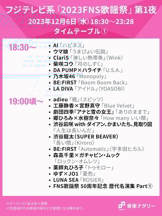 本日12月6日18:30よりフジテレビ系で放送される「2023FNS歌謡祭」第1夜のタイムテーブルが発表された。