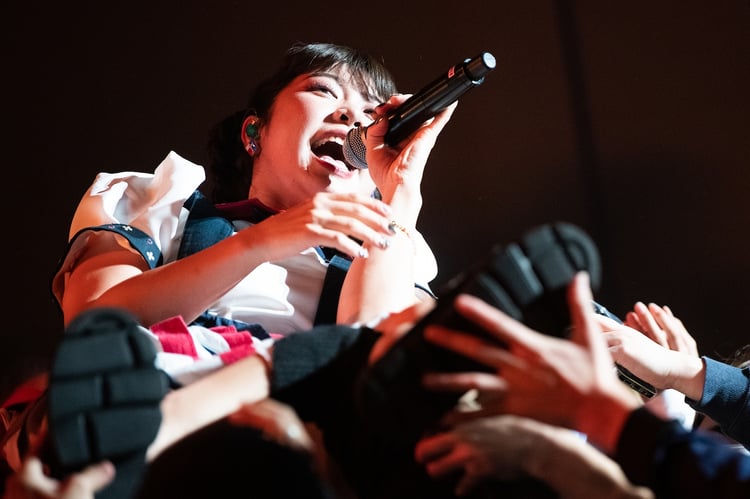 7カ月間にわたるツアーの最終地点となった恵比寿ザ・ガーデンホールには、小さな子供から大人までさまざまなマユムラー(眉村ちあきファンの呼称)が集まり、眉村が幅広い世代に愛されていることがうかがえた。開演前には本人が「みんなニコニコでスキップで帰れるように周りの人の迷惑になるような異常な行動は避けましょう!」と注意事項をアナウンス。1曲目「ナントカザウルス」でエネルギッシュな歌声を放つと、オーディエンスはその力強い歌声に負けじと、タオルを振り回したり拳を振り上げたりする。続く「ピカレスクヒーロー」ではダンサブルなトラックに乗せて、マユムラーが心も体も解放するかのように踊った。さらなる熱気を呼び起こすように「肉喰え」がドロップされると、眉村は興奮のあまりフロアにダイブ。マユムラーに体を支えられながら、とめどない衝動を歌声で表現した。