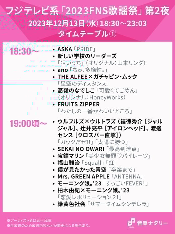 ASKASixTONESSEKAI NO OWARIゆず櫻坂46新しい学校のリーダーズanoあのTHE ALFEE高嶺のなでしこFRUITS ZIPPERスキマスイッチDa-iCE花村想太上白石萌音竹内涼真マカロニえんぴつINI福山雅治King GnuMrs. GREEN APPLEさだまさし三浦大知ももいろクローバーZウルフルズ福徳秀介ジャルジャルアイロンヘッドクロスバー直撃僕が見たかった青空モーニング娘。'23柏木由紀AKB48緑黄色社会aikoENHYPENキタニタツヤKinKi KidsCreepy Nutsmilet生田絵梨花=LOVETUBEGACKT羊文学Night Tempo広瀬香美山崎育三郎Little Glee MonsterTHE RAMPAGEHYLiella!
