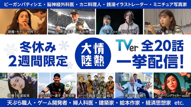 TVerでは過去5年間に放送された「情熱大陸」の20作品を無料再配信。配信作品の中にはYOASOBI、純烈、miletのほか、藤田ニコル、中村アン、錦鯉、安達祐実などの登場回もラインナップされている。