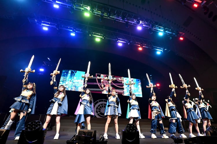 「結び」「メタハンマー」が届けられたあとは“最終試練“へ。最終試練の内容は、東北産が皆産を盛り上げ、ステージ後方のスクリーンに映し出された“ボルテージメーター“をマックスにするというもの。オーディエンスとコール&レスポンスを繰り返し、場内の士気を統一したメンバーは、「どっち?こっち?どうすっぺ!」や、TikTokで話題になった楽曲「わざとあざとエキスパート」など4曲を連続で披露。ハイテンションなステージに、観客は大きな歓声を上げた。ボルテージメーターがマックスとなり、ステージ左右の高台には2本の剣が。最後の2本は橘と葉月が息を合わせて引き抜き、ステージに9本の剣がそろった。それぞれのメンバーカラーの石が埋め込まれた剣に「カッコいい!」と素直な感想を述べた9人は、そのまま剣を片手に、応援してくれたオーディエンスへの感謝を込めて「ワンダフル東北」を歌い上げた。その後、半円状に並んだメンバーは、それぞれの剣を掲げると、1人ずつステージ後方に設置された円形の台座に剣を納める。9本の剣が台座に納められると、後方スクリーンに“伝説の羽”が現れた。伝説の羽を手に入れた彼女たちは、伊達のアカペラから「Whatever」で情感がこもった歌声を響かせた。