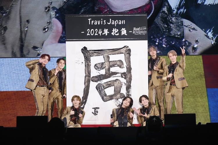 続いて個人の抱負を聞かれた宮近は「コンサートが仕事初めってなかなか経験できることじゃないので、このありがたみを胸に、今年は仕事納めもコンサートにしたいです」、吉澤は「俺は振付をいっぱい考えたい。ジュニアの子たちに振り付けするとか、いろいろできたらいいな」と声を弾ませる。七五三掛は「グループのやりたいことが叶う年になったらいいなと思います。あとは美容関係のアンバサダーをやりたいです。『名探偵コナン』も大好きなのでTravis Japanで主題歌がやれたらうれしいですね」、松田は「(去年は)いろんな経験をさせていただいたので、今年もいろんな経験をさせていただきたいですね。視野を広くしてファンのみんなと楽しくできたらいいなと思います」とにっこり笑った。中村は「健康に過ごせればと思います。体が“基本”だから……資本だから」と川島の指摘を受けながらコメント。松倉は「ファンの皆さんに会える機会を増やしたいです。個人では個展をやってみたいなって。趣味で写真を撮ったりアクリルアートを始めたので」と明かし、“資格マニア”の川島は「Travis Japanの強みの1つになるように、今年は総合旅行業務取扱管理者の資格を取得したいですね。ワールドツアーのプランが組めるんですよ。コンサートのチケット、ホテル、航空券……と安全なパッケージでお届けできると思います」と早口で語った。会見の最後にはメンバーが「周」の文字を囲み、宮近が「2024年もファンのみんなとともにいろんなところを“周って”、“周り”のみんなを幸せにするグループになっちゃってもいいですか?」とファンに問いかけると、会場には「賛成ー!」の声がこだました。