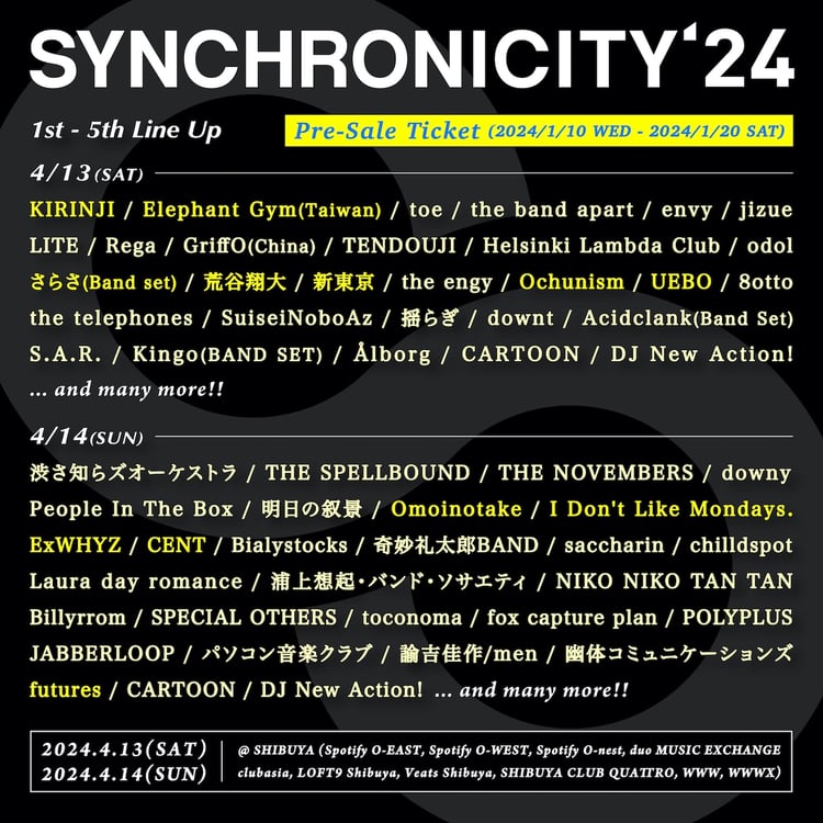 4月13、14日に東京・渋谷の10会場で行われるライブイベント「SYNCHRONICITY'24」の第5弾出演アーティストが明らかになった。