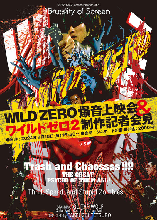 ギターウルフが主演を務め、1999年に公開された映画「ワイルド・ゼロ」の爆音上映会が2月18日に東京・シネマート新宿で実施される。併せて、竹内鉄郎監督とギターウルフのセイジ(Vo, G)による続編「ワイルドゼロ2」の制作記者会見が行われることも決定した。