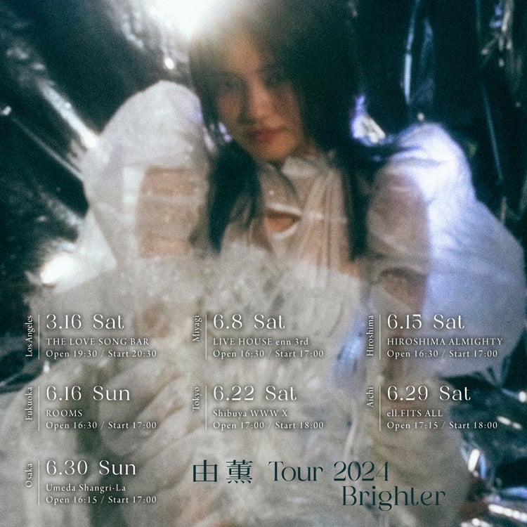 1月17日リリースの同名アルバムを引っ提げて行われる「Brighter」。本ツアーで由薫は、初となるアメリカ・ロサンゼルス公演を3月16日に開催したのち、全国6都市を回る。ローソンチケットでは1月23日までチケットの先行予約を受付中。なおロサンゼルス公演は弾き語りで行われる。