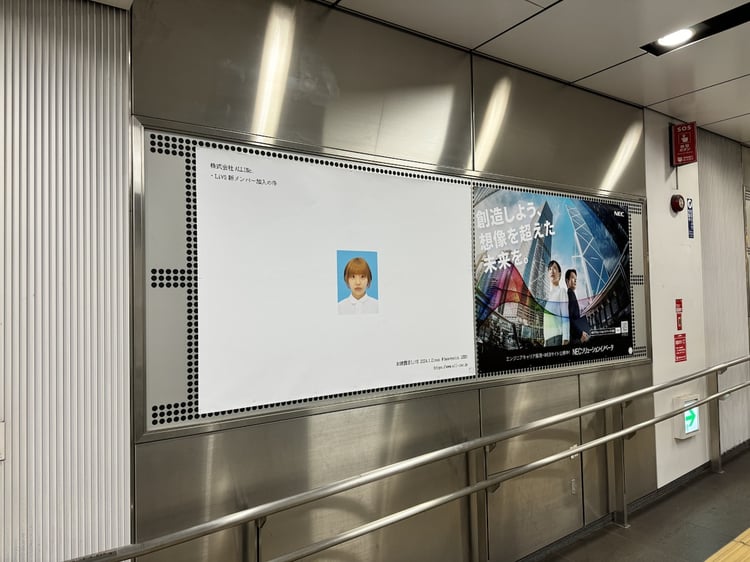 アイドルグループ・LiVSの新メンバー「ミニ・マルコ」の証明写真を使った広告が、東急渋谷駅の宮益坂東改札に掲出されている。