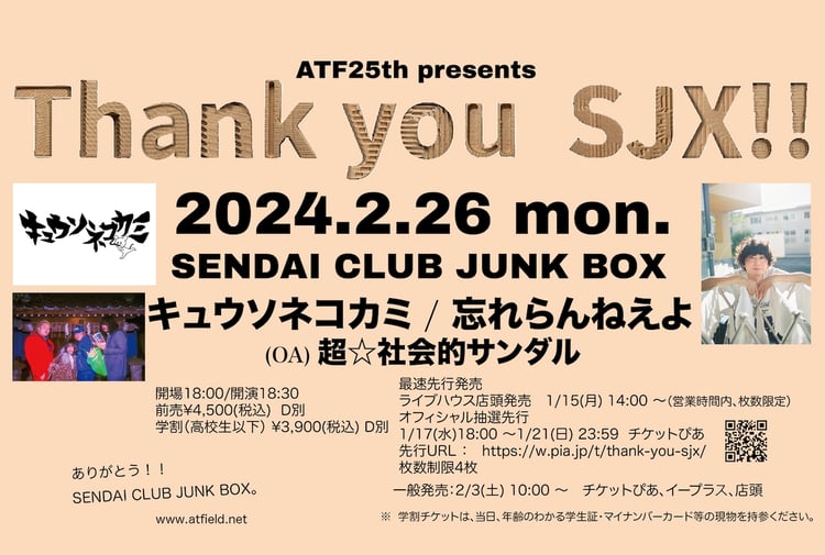 2月26日に宮城・SENDAI CLUB JUNK BOXで開催されるイベント「ATF 25th presents Thank you SJX!!」にキュウソネコカミと忘れらんねえよが出演する。