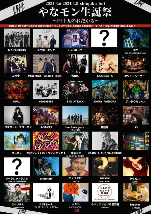 東京・新宿LOFTの店長・やなモン。の生誕祭イベント「やなモン生誕祭~四十五の春だから~」が3月6、8日に同会場で開催される。