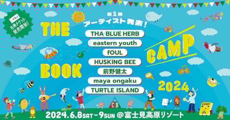 「THE CAMP BOOK」は2017年にスタートし、今回が6回目の開催となる野外フェス。出演アーティスト第1弾としてラインナップされたのは、THA BLUE HERB、eastern youth、fOUL、HUSKING BEE、前野健太、maya ongaku、TURTLE ISLANDの計7組で、イベントには総勢40組前後の出演が予定されている。