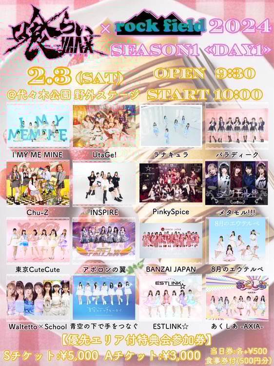 2月3日公演にはI MY ME MINE、Chu-Z、PinkySpice、BANZAI JAPANら女性アイドルグループ16組、2月4日公演にはAnimal☆Collection、illumi/nate、ALL IN、7riotらメンズグループ16組が出演する。チケットはそれぞれ優先エリアSと優先エリアAの2種類。チケットの販売スケジュールについてはrock fieldのX(Twitter)公式アカウントなどで確認を。