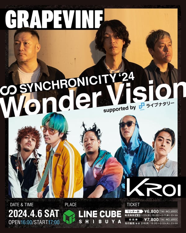 GRAPEVINE、Kroiが4月6日に東京・LINE CUBE SHIBUYA(渋谷公会堂)にて開催されるライブイベント「SYNCHRONICITY'24 Wonder Vision supported by ライブナタリー」に出演する。