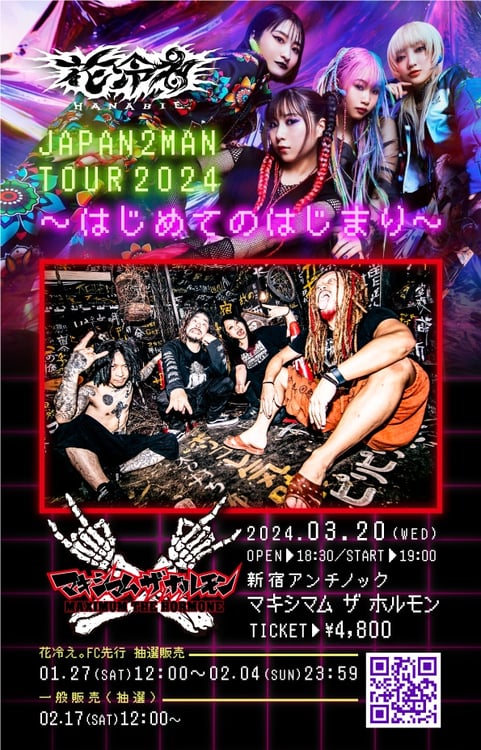 花冷え。は現在、全国ツーマンツアー「花冷え。JAPAN 2MAN TOUR2024~はじめてのラブリー伝説~」を開催中。バンド結成のきっかけになったマキシマム ザ ホルモンとのツーマンライブは、このツアーの追加公演「~はじめてのはじまり~」として行われる。花冷え。のオフィシャルファンクラブでは明日1月27日12:00よりチケットの抽選販売が行われる。