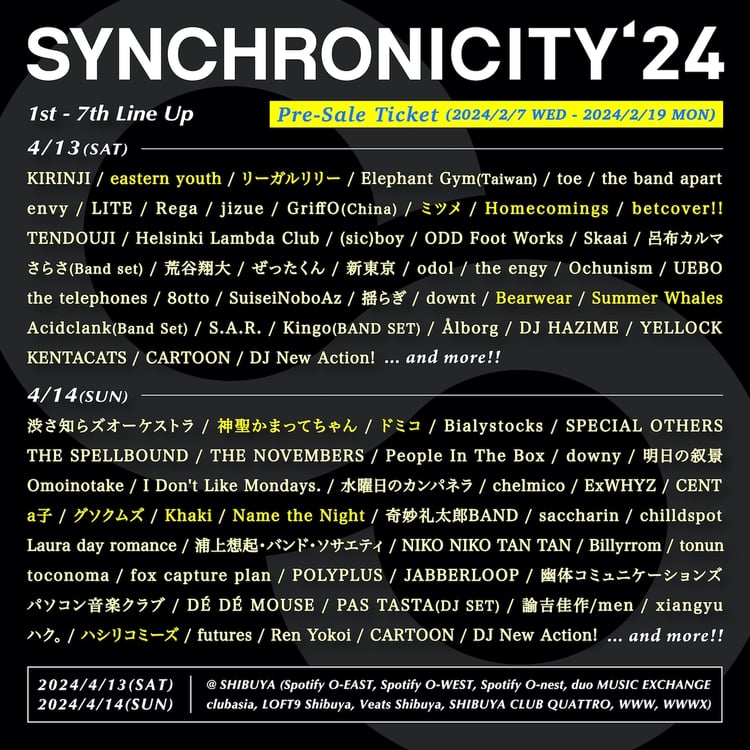 4月13、14日に東京・渋谷の10会場で行われるライブイベント「SYNCHRONICITY'24」の第7弾出演アーティストが発表された。