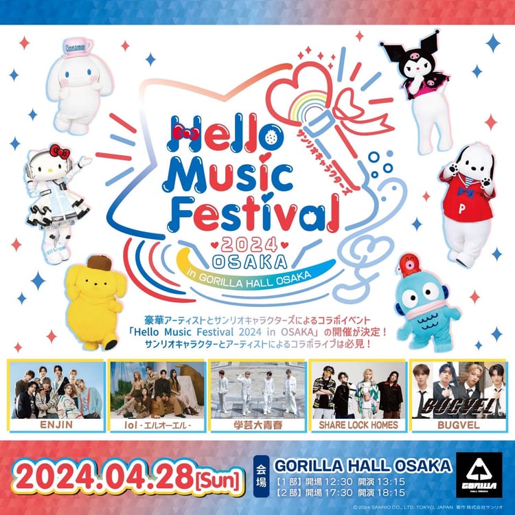 アーティストとサンリオキャラクターズによるコラボイベント「Hello Music Festival 2024 OSAKA」が大阪・GORILLA HALL OSAKAで4月28日に開催される。
