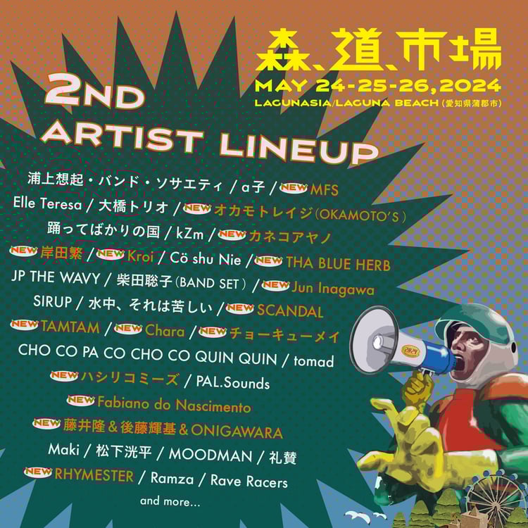 5月24、25、26日に愛知・蒲郡ラグーナビーチとラグナシアで開催される野外イベント「森、道、市場2024」の出演アーティスト第2弾が発表された。