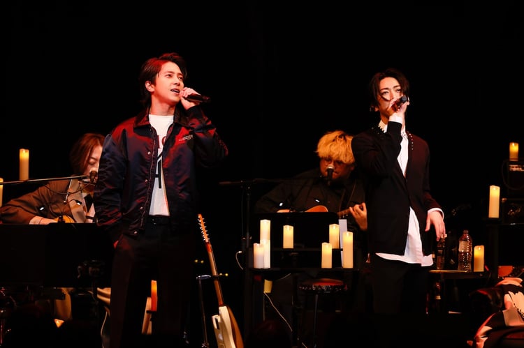 マンガ家・ひうらさとる描き下ろしのアニメーションフィルムを経て、亀梨はキャンドルの灯りが幻想的に場内を照らすステージで自身の楽曲「絆」をしっとりと歌唱。そしてギター、ブルースハープを担当する山下穂尊とともに、いきものがかりの「オリオン」を優しい歌声で届けた。