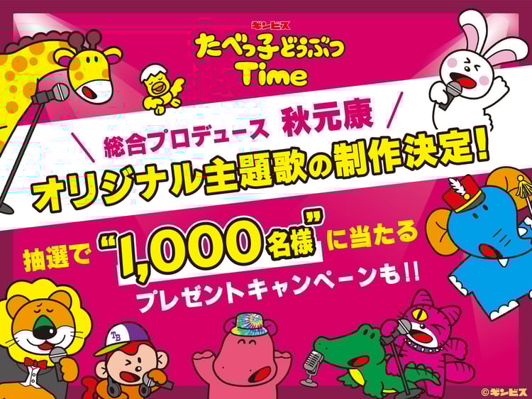 「たべっ子どうぶつTime」は株式会社ギンビスのビスケット「たべっ子どうぶつ」の公式パズルゲームアプリで、3月にリリース予定。オリジナル主題歌の歌唱者は、秋元プロデュースによる「たべっ子どうぶつTime主題歌オーディション」にて決定する。そのほかの詳細情報は追って発表される。