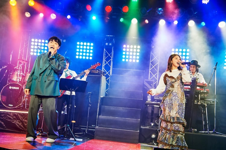 MCでは「次の曲は20年ぶりに演奏します。当時もステージにコーラスで真城めぐみさんがいてくれました。それ伝えたら、真城さん覚えてなかったけど!」というエピソードを紹介しつつ、「流星カルナバル」を歌唱。そして最新アルバム「FIT」から「月光地帯」「存在」を演奏し、グルーヴィなイントロから始まる「ベンジャミン、空を睨む」のラストで“お祝いゲスト”である竹内朱莉(ex. アンジュルムの)をステージに迎え入れた。
