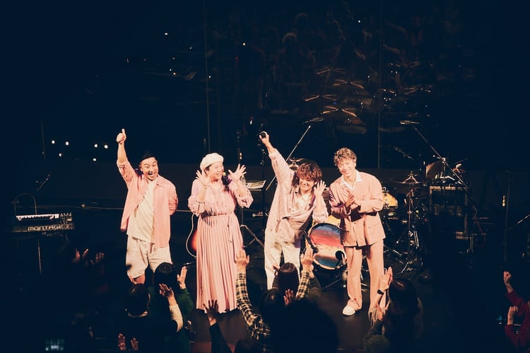 続いて軽快なアップチューン「さよならまたね」、情感豊かなバラード「あの日のまま」などで客席をじわじわと温めたHY。許田信介(B)の音頭で観客と乾杯をしたのち、トークを展開した。「1年が1日多い分、やりたいこと」というお題に、名嘉俊(Dr)は「ワカサギ釣り」と回答。仲宗根泉(Key, Vo)が「HYのライブ初めての人?」と客席に呼びかけると多くの手が挙がり「なんで初めて来てみようと思った? 時間を割いてくれてうれしい」と喜んだ。「今日は素敵な気持ちで帰れるように」という曲振りで演奏されたのは、特別アレンジのラブソング「I LOVE YOU」。次の「花束」では新里英之(Vo, G)が客席をぐるりと歩き、ファンとのコミュニケーションを楽しんだ。
