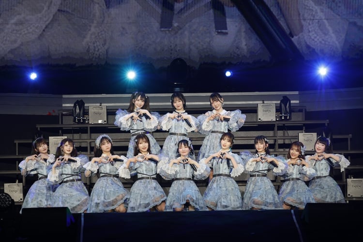 ユニットコーナーが終わると、12人はカラフルな衣装へチェンジ。“超絶かわいい注意報”が発令され、避難を呼びかけるアナウンスが流れると、メンバーは弾けるような笑顔で客席通路へ飛び出し、観客と視線を合わせたり手を振ったり、たっぷりとファンサービスをしながら「想わせぶりっこ」を歌唱した。「想わせぶりっこ」はストレートな愛情を描いた“あまあまラブソング”で、笑顔を見せずに踊る楽曲が連続したライブ序盤とは真逆とも言える、朗らかでキュートなムードに場内が塗り替えられる。続く「てゆーか、みるてんって何?」ではメンバーがトロッコに乗って場内を巡り、「ポニーテール キュルン」の曲中にはファンによる“ガチ恋口上”が盛大に響きわたった。永田と本田がダブルセンターを務める「ヒロインとオオカミ」では、ミュージックビデオと同様にメンバーが“オオカミ”の耳を付けた衣装でパフォーマンス。彼女たちのかわいらしい姿に、客席のあちこちから大きな歓声が上がった。