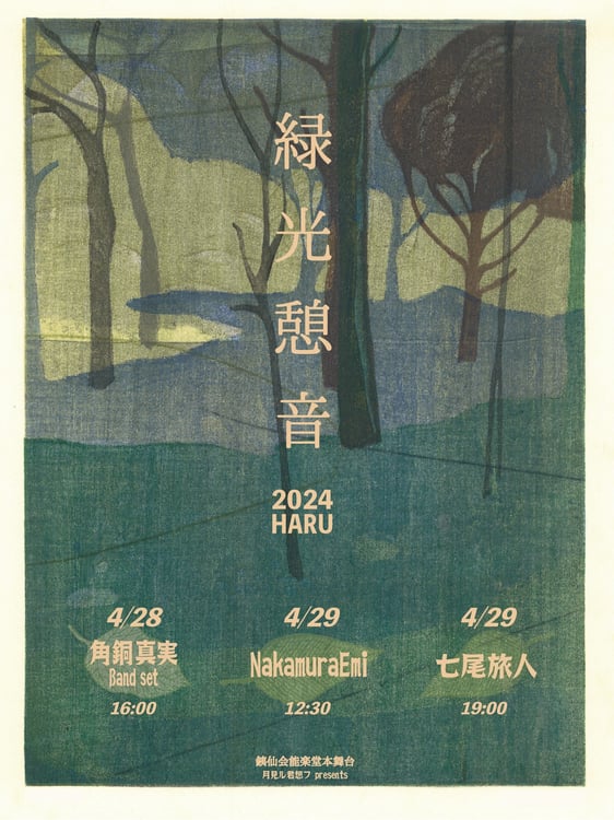 東京都青山のライブハウス・月見ル君想フがプロデュースするアコースティックライブイベント「緑光憩音2024HARU」が、4月28日と29日に東京・青山銕仙会能楽堂本舞台で開催される。