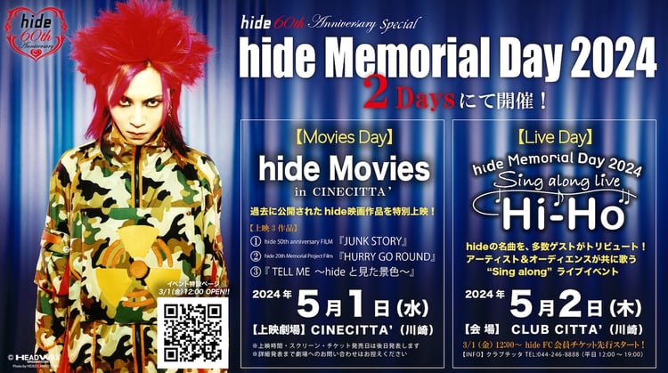 なお今年の「hide Memorial Day」は5月1日と2日の2DAYS開催。初日は「Movies Day」と銘打ち、過去に全国公開されたhide映画が、CINECITTA'にて特別上映される。上映作品は「JUNK STORY」「HURRY GO ROUND」「TELL ME ~hideと見た景色~」の3つだ。