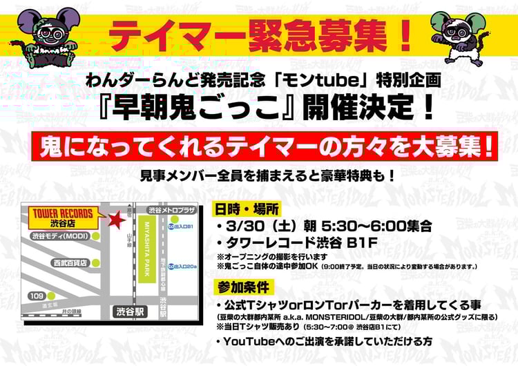 これは4月3日に1stシングル「わんダーらんど」がリリースされることを記念して行われる、グループのYouTube公式チャンネル「モンtube」の特別企画。鬼ごっこに参加したい人は早朝5:30から6:00までに東京・タワーレコード渋谷店B1F CUTUP STUDIOに行こう。参加条件はMONSTERIDOL、豆柴の大群、都内某所のいずれかのTシャツかロンT、パーカーを着用することと、YouTube出演を承諾できること。Tシャツは朝7:00までタワレコ渋谷店B1Fで販売されるので、忘れた場合も安心だ。