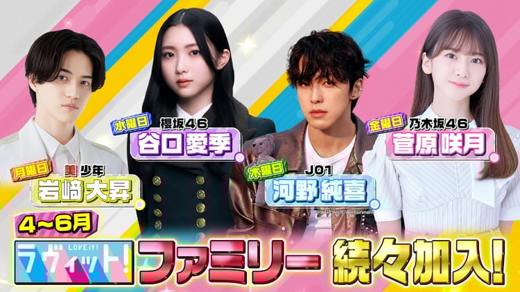 4~6月の「ラヴィット!ファミリー」として、アイドル4名が月曜、水曜、木曜、金曜それぞれに来週の放送から加入することが決定。月曜は美 少年の岩崎大昇、水曜は櫻坂46の谷口愛季、木曜はJO1の河野純喜、金曜は乃木坂46の菅原咲月が担当する。なお岩崎は昨年1~3月の月曜、今年1~3月の水曜にも出演しており、史上最多の3度目の「ラヴィット!ファミリー」となる。